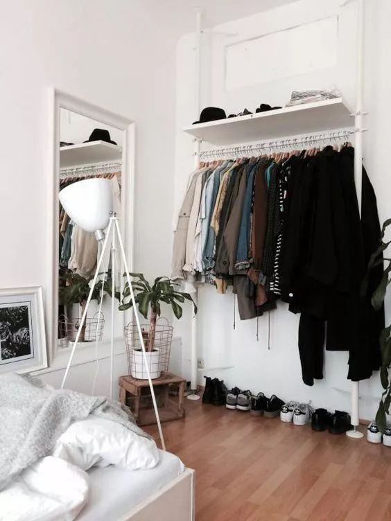 如果卧室条件实在不允许装衣帽间,可以用简单的衣架,用来收纳当季穿的衣服和鞋子,灵活方便又节省成本。