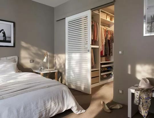 卧室面积足够大或者卧室内的卫生间想改造成衣帽间,都可以通过巧妙的设计,将衣帽间与卧室隔断,用隐形门或者装饰类的门链接这两个空间,营造私密感,也实现了空间分隔,突显装饰性能。