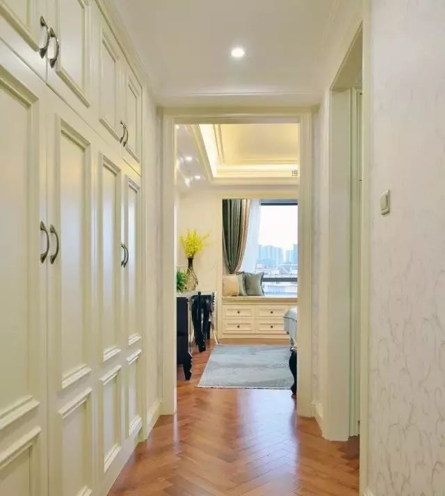 进门后如果两侧空间允许的话,可以将这个空间的两侧或侧边利用起来,做成一个小小的衣帽间,一进卧室就感受到满满的整洁舒适。